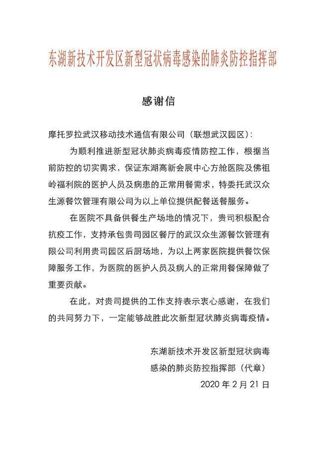 “能第一时间把热腾腾的饭餐送到医院,让大家感受到温暖,一切都是值得的。”一名联想员工曾这样表示。他们的事迹鼓舞着抗疫前线每一个人,而他们也收到了来自东湖新技术开发区新冠肺炎防控指挥部的诚挚感谢。